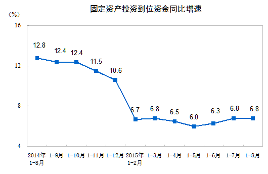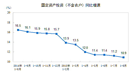 2015年1-8月份,全國固定資產投資(不含農戶)338977億元,同比名義增長10.9%,增速比1-7月份回落0.3個百分點。從環比速度看,8月份固定資產投資(不含農戶)增長0.73%。