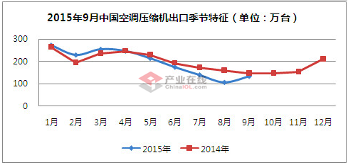 據最新監測數據顯示,2015年9月我國空調壓縮機出口133萬臺,同比下滑11.1%,環比增長25.6%;出口金額0.9億美元,同比下滑7.8%,環比增長22.0%。從財年累計情況來看,我國空調壓縮機2015年1-9月出口總計1776萬臺,同比下滑4.7%;出口金額總計11.4億美元,同比下滑5.6%。