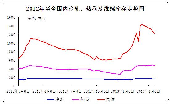 圖三:2012年至今國內冷軋、熱卷及線螺庫存走勢圖