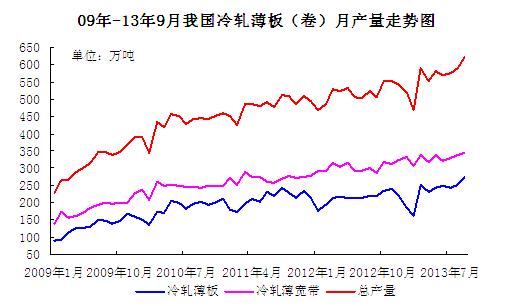 9月份我國冷軋板卷產量再度刷新歷史紀錄,并且突破600萬噸的整數關口。當月冷軋板卷產量合計619.8萬噸,環比增加30.8萬噸,同比增幅達到22.44%。具體來看,冷軋薄寬鋼帶產量為343.4,環比增加5.3萬噸;日均產量11.45萬噸,環比增加0.54萬噸,冷軋薄寬鋼帶月產量及日產量雙雙創下歷史新高。冷軋薄板當月產量為276.4萬噸,環比增加25.5萬噸,增量呈現放大趨勢;日均產量9.21萬噸,環比增加1.12萬噸。2013年1-9月我國冷軋板卷總產量為5062.7萬噸,較去年同期累計增加488.2萬噸,累計比同期增長10.67%。