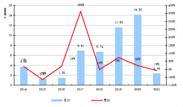 2014-2021年天然氣重卡市場終端銷量年度走勢圖(單位:萬輛)