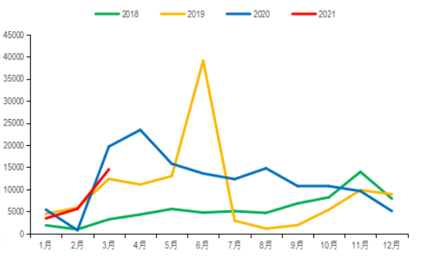 2018-2021年天然氣重卡市場終端銷量月度走勢圖