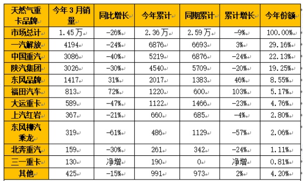 東風品牌(主要包括東風商用車、東風華神等東風品牌的卡車)今年3月份銷售天然氣重卡1417輛,同比逆勢增長31%;一季度東風品牌累計銷售燃氣重卡2017輛,同比逆勢增長46%,市場份額為8.55%,上升了3.2個百分點,行業排名也上升一位至第四名。福田汽車從去年同期的行業第八上升至今年的行業第五,其3月份銷售天然氣重卡813輛,逆勢增長72%;一季度累計銷售1220輛,同比逆勢大幅上漲103%,市場份額上升至5.17%,上漲了2個多百分點。第六名大運重卡3月份銷售天然氣重卡589輛,一季度累計銷售天然氣重卡1122輛,市場占有率為4.76%。