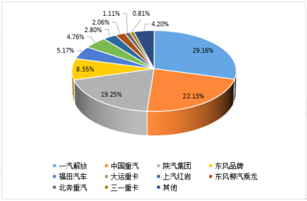 總體來看,解放、重汽、陜汽繼續構成了天然氣重卡市場的第一陣營,這三家企業的各自市場份額均超過19%,后面幾名的企業距離前三的差距較大,暫時難以撼動其地位。
