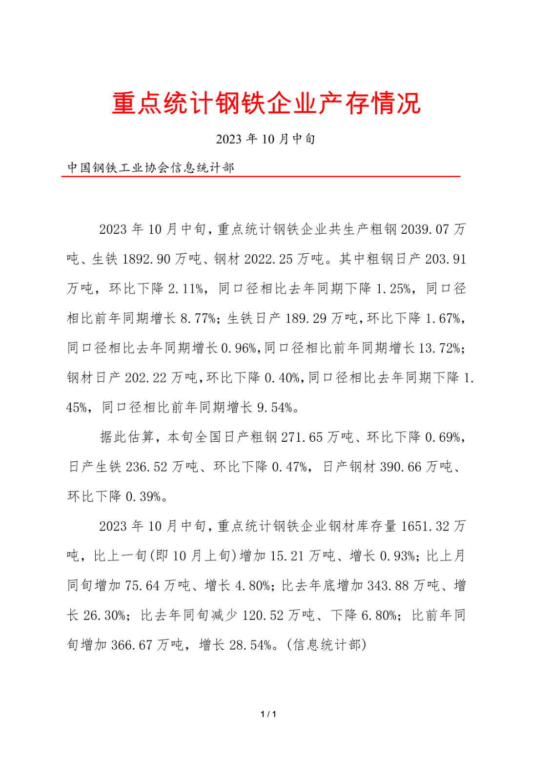 據中鋼協數據顯示,2023年10月中旬,重點鋼企粗鋼日均產量203.91萬噸,環比下降2.11%;鋼材庫存量1651.32萬噸,比上一旬(即10月上旬)增加15.21萬噸,增長0.93%