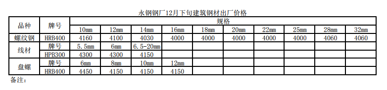 (關鍵字:永鋼鋼廠12月下旬建筑鋼材出廠價格)