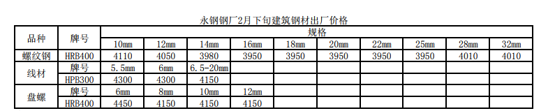 2019年永鋼鋼廠2月下旬建筑鋼材出廠價格表執行