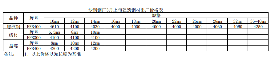 2019年沙鋼鋼廠3月上旬建筑鋼材出廠價格表執行