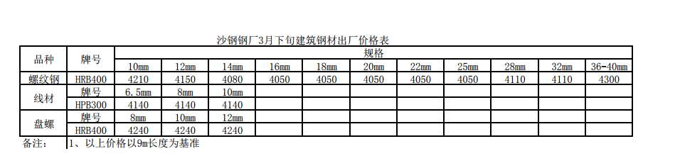2019年沙鋼鋼廠3月下旬建筑鋼材出廠價格表執行