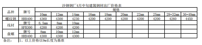 2019年沙鋼鋼廠4月中旬建筑鋼材出廠價格表執行