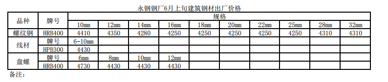 2019年永鋼鋼廠6月上旬建筑鋼材出廠價格表執行