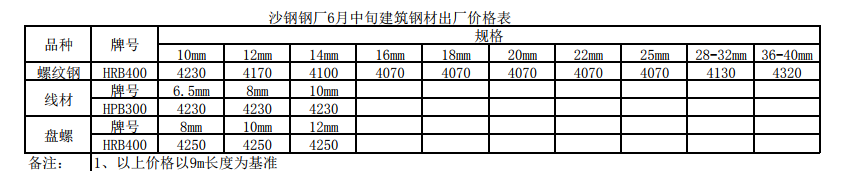 2019年沙鋼鋼廠6月中旬建筑鋼材出廠價格表執行