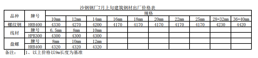 2019年沙鋼鋼廠7月上旬建筑鋼材出廠價格表執行