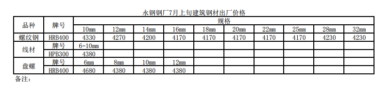 2019年永鋼鋼廠7月上旬建筑鋼材出廠價格表執行