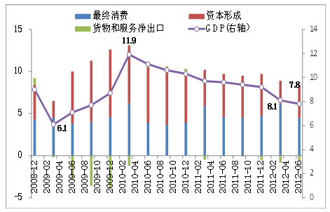 2012年二季度國內GDP增速延續了自2010年二季度以來的持續下滑態勢,當季GDP同比增速僅為7.6%,為近3年以來首次破8。消費、房地產投資以及出口增速的持續回落是二季度GDP增速下滑的主要原因。從“三駕馬車”對GDP的累計拉動作用來看,二季度最終消費對GDP的拉動作用為4.5個百分點,較一季度回落1.7個百分點;資本形成對GDP的貢獻由一季度的2.7個百分點上升至3.9個百分點,我們認為這主要是受到4月份以來政府基建投資加快所致;貨物和服務的凈出口對GDP的貢獻由一季度的-0.8%小幅回升至-0.6%,主要是由于進口增速回落遠大于出口導致貿易順差超預期擴大所致。