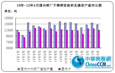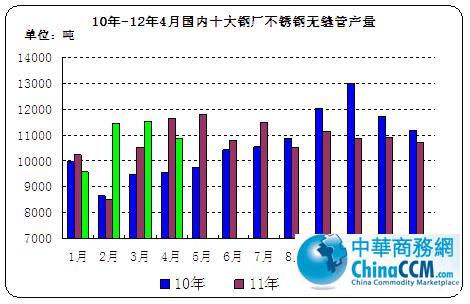 12年4月國內十大鋼廠不銹鋼管坯和無縫管產量環比都小幅減少,國內十大鋼廠不銹鋼管坯產量12800噸,環比-4.48%,國內十家不銹鋼無縫管產量10900噸,環比-5.22%。行情低迷,庫存消耗不出,各大鋼廠減產。