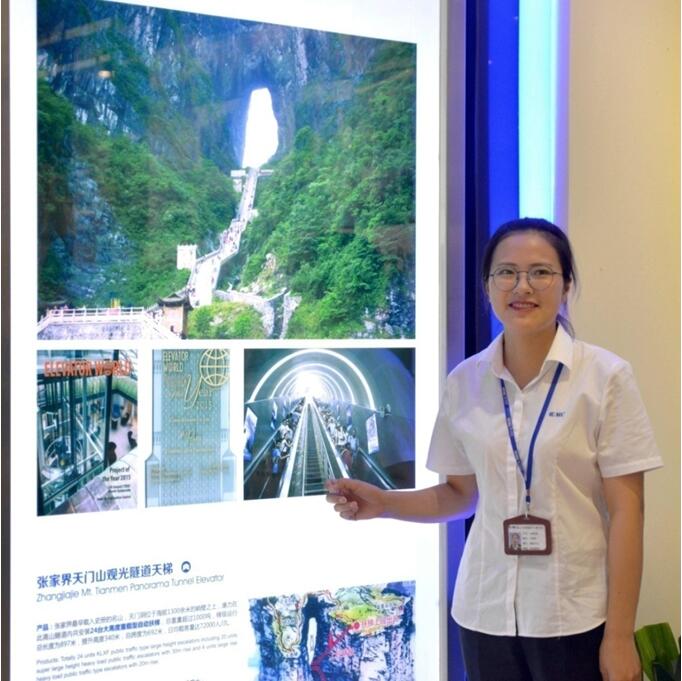 圖二、康力電梯展館員工在解說天門山觀光隧道扶梯。楊木軍攝