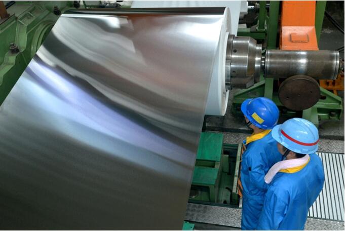 圖三、大明員工在檢查電梯用不銹鋼面板質量。楊木軍攝