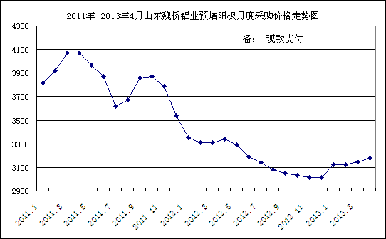 2011年-2013年4月山東魏橋鋁業(yè)預(yù)焙陽極月度采購價格走勢圖: