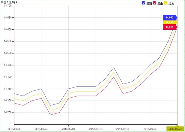 自本周起,電解鋁現(xiàn)貨受庫存量不斷縮減和下游采購企業(yè)節(jié)前備貨的影響,現(xiàn)貨電解鋁價(jià)格反彈270元/噸,截止周五(2013.9.27)長江現(xiàn)貨電解鋁價(jià)格14610-14650元/噸,均價(jià)14630元/噸。