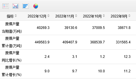 在此前公布的國家統計局月度統計數據中,2022年我國全年原煤產量為449583.9萬噸。