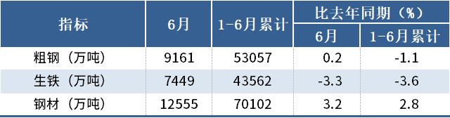 1-6月,中國粗鋼產量53057萬噸,同比下降1.1%;生鐵產量43562萬噸,同比下降3.6%;鋼材產量70102萬噸,同比增長2.8%。