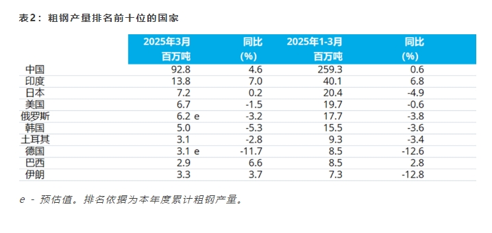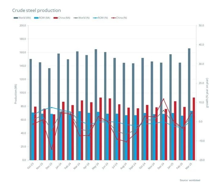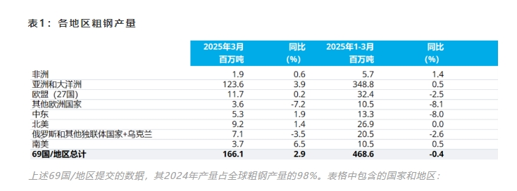 2025年3月全球69個納入世界鋼鐵協會統計國家/地區的粗鋼產量為1.661億噸,同比增長2.9%。