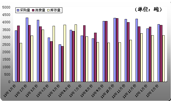 下圖為2011年1月-2012年2月日本鋁合金行情對于金屬硅的進口、消費和庫存量統計圖: