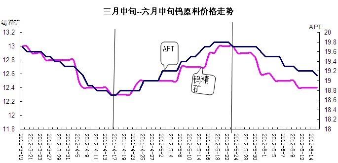 在需求乏力,礦山慌亂,冶煉企業消耗庫存的時候,鎢價達到了低點。隨后有消息放出某國內大廠開始要穩價,拿出多少錢收購精礦,鎢價由源頭斷鎢精礦的惜售開始看漲,這是暗淡了七八個月后的第一次看漲,鎢精礦價格直報道12.8萬,APT的報價更是高達20萬,前期的合金廠,中間的粉末企業紛紛進場采購,但是這種行情僅僅維持了幾天,由于缺乏需求支撐,市場開始平穩的下調,六月五礦的黑鎢標礦報價13萬,仍沒有挽回鎢價直線下走的趨勢,六月中旬,鎢精礦價格12.4-12.5萬,APT價格19萬。