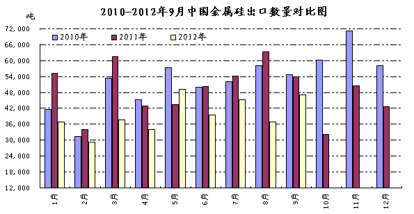 9月出口量雖比8月增加,但也大不如去年同期,其中出口日本10822噸,同比下滑43.7%;韓國8461噸,同比下滑27.4%;泰國4332噸,墨西哥2869噸,香港1748噸。受釣魚島事件影響,中日關系十分緊張,日系汽車產量大幅度下降,導致豐田汽車減少汽車產量,正因如此,日本對金屬硅需求下降,這也是影響我國金屬硅出口量減少的原因之一。