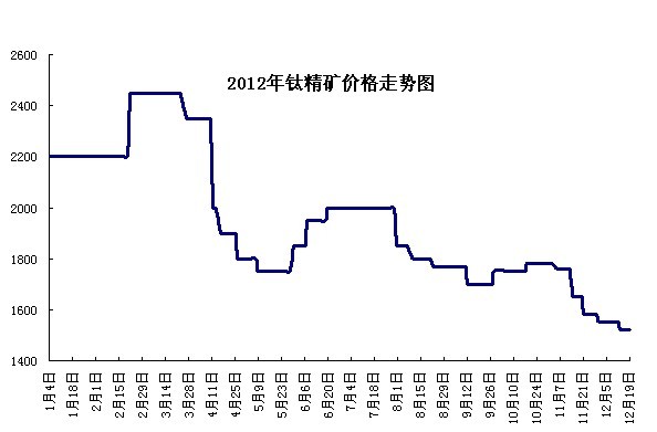 2012年對鈦精礦價格來說,可謂低位盤整的一年,雖然2011年礦價從900元漲到2000元收尾,可2012年卻從2000元跌至1300元,跌幅較大。