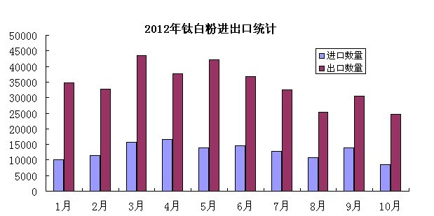 截止十月,鈦白粉的出口量為340782噸,進(jìn)口量為128077.7噸,從上圖可以看出,進(jìn)口量每個月基本都差不多,但總體來看,而出口卻在三,五月份量較多。在全球經(jīng)濟(jì)部景氣時期,我國進(jìn)口量減少的同時,出口量也不容樂觀,這給國內(nèi)銷造成壓力,使得鈦白粉的國內(nèi)競爭更加激烈。