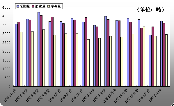 下圖為2012年1月-2013年2月日本鋁合金行情對于金屬硅的進口、消費和庫存量統計圖: