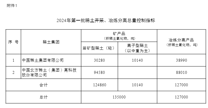 附件:1. 2024年第一批稀土開采、冶煉分離總量控制指標