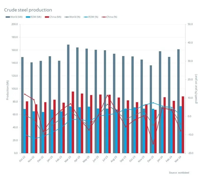2024年3月全球71個(gè)納入世界鋼鐵協(xié)會(huì)統(tǒng)計(jì)國(guó)家的粗鋼產(chǎn)量為1.612億噸,同比下降4.3%。