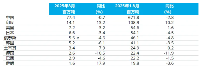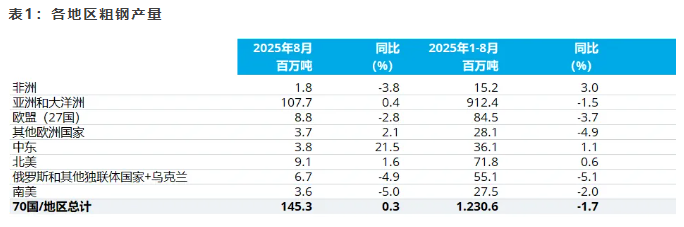 2025年8月全球70個納入世界鋼鐵協(xié)會統(tǒng)計國家/地區(qū)的粗鋼產(chǎn)量為1.453億噸,同比提高0.3%。