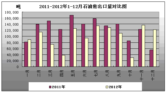 以下是2011-2012年1-12月石油焦出口量對比圖:
