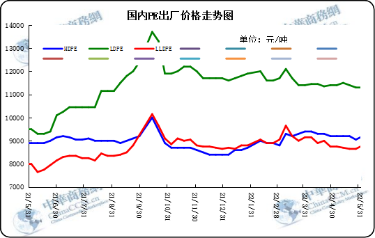 本月,國內聚乙烯價格震蕩下跌。由于公共衛生事件在國內部分地區仍在延續。農膜行業進入淡季,聚乙烯下游需求不足,對價格支撐有限。而供應方面,新增檢修裝置較少,開工裝置增加,市場供應壓力相對增大。由于俄烏戰事尚不明朗, 原油價格維持高位震蕩,對成本面起到一定支撐,生產企業月內存在挺價意向,從而,導致市場跌幅有限。月末階段,隨著公共衛生事件防控措施的緩和,下游需求出現增加,疊加原油價格上漲帶動,市場價格小幅上漲。但本月國內價格較上月相比仍舊處于下跌態勢。