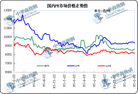本周國內聚乙烯市場震蕩整理,國內乙烯市場價格走勢穩中向弱。隨著終端開工率進一步提高,疊加北方陸續進入春耕,農膜地膜需求量增加,然今年工地開工遲緩,管材需求不及往年,但下游原料庫存消耗,市場內詢盤氣氛提升。然近期聚乙烯主力期貨多弱勢震蕩,業者多利空心態,采購心態多謹慎,本周貿易商多隨行出貨為主。現階段聚乙烯生產廠家繼續按計劃檢修生產線,本周裝置檢修數量較上周稍有減少,兩油庫存較比上周同期基本持穩,聚乙烯市場內供大于需現狀仍在。據百川盈孚統計,本周大型生產商的聚乙烯報價窄幅調整為主,不等,較前期波動幅度縮減。綜上所述,本周聚乙烯市場價格在多方因素影響下窄幅震蕩整理。
