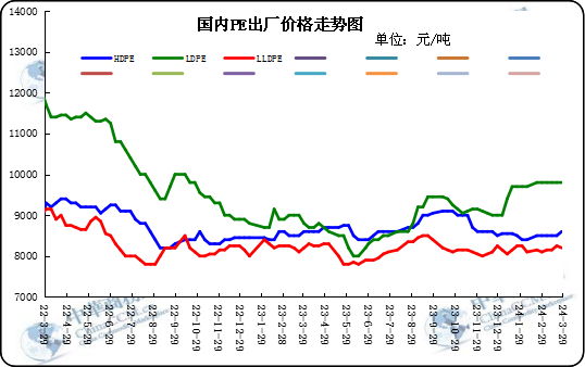 后市預測:本月聚乙烯市場價格受上游原料和國內需求影響,主流期貨盤面震蕩不斷,市場價格跟盤調整,成交價格重心小幅上漲,預計下月聚乙烯市場價格或將在繼續震蕩,原料面,中美經濟表現較好,而美聯儲3月不降息成為定局,然俄烏局勢緊張,未來地緣政治局勢仍具有不確定性;乙烯市場供應減少,乙烯成本端利好。場內連云港石化、浙石化等主力工廠即將進行檢修,場內現貨供應預計減少。成本面對聚乙烯市場指引較強。供需面,隨著檢修企業增加,本月市場供應壓力有所緩解;疊加市場交投表現稍有好轉,下游農膜企業開工率上升,其他終端行業需求恢復緩慢。市場供需矛盾短期內無有效解決方法,供需面對聚乙烯市場指引一般。綜合來看,隨著天氣的回暖,國內化工需求旺季和汽油消費旺季相繼到來,國內終端石油消費逐步回暖,同時美國消費旺季也將來臨,預計下月原油價格或震蕩偏強走勢。下游恐漲報貨積極性增加,新單商談氛圍好轉或推動價格進一步走高,預計下月國內乙烯市場價格走勢上行。市場需求緩慢好轉,然月末期貨走低帶動業者心態,疊加市場庫存高位,近期聚乙烯市場走勢平平。但在原油及終端需求雙重利好因素作用下,上游原料面或對聚乙烯市場起到一定支撐,預計下月國內市場行情震蕩有漲。