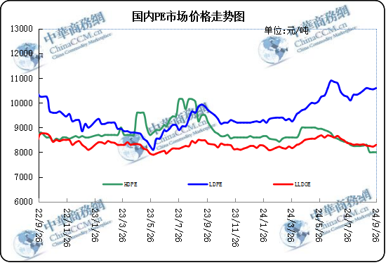 后市預測:本周聚乙烯市場價格整體上漲,成本端支撐表現一般,需求端表現尚可,聚乙烯市場后續或將繼續緩慢升溫,預計下周聚乙烯價格或將延續向暖,不排除有期貨強力拉動影響。本周美聯儲大幅降息及中國將推出多項刺激政策,提振市場情緒,利好油市,但這也引發了市場對經濟及需求前景的擔憂,未來市場對經濟及經濟引發的需求擔憂情緒反復施壓油市。國內乙烯供應呈增加趨勢,且外盤貨源充足,供應端利空,下游需求端回落同樣抑制價格走高,場內低價貨源增加明顯。成本面對聚乙烯市場支撐一般。十一假期臨近,需求熱度繼續回升,終端市場對薄膜需求仍在緩慢增加,下游開工率亦持續回升,多持謹慎心態小量采購原料。現階段下游原料庫存消耗速度尚可,或在“十一”節前有適量備貨行為,下周供需面對聚乙烯市場支撐力或將持續增強。綜合來看,利比亞供應緩解,隨著消費淡季的來臨,市場對需求擔憂情緒較重且反應敏感,原油基本面預期持續偏弱,下周市場可能仍以需求偏弱主導,預計下周國際原油價格或以震蕩偏弱為主。成本端支撐不足,場內缺乏利好消息引導,與此同時低價貨源的增加,加重了業者看空情緒,預計下周乙烯市場延續弱勢。成本面支撐一般、供需面表現好轉有限,疊加期貨市場波動等多重因素影響下,聚乙烯后市仍然復雜多變。預計下周國內市場價格窄幅震蕩。