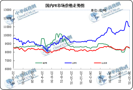 本周國內聚乙烯市場價格先跌后漲,市場內成交氛圍稍顯清淡。本周市場需求支撐力稍顯疲軟,聚乙烯價格亦受成本端影響較大:其中本周地緣風險溢價消退,國際油價震蕩下跌;本周國內乙烯市場價格穩中上漲。近期原料支撐力有限,需求亦愈發清淡,市場現貨庫存下降速度放緩。面對低價不斷刷新,下游采購心態謹慎,臨近月底銷售多積極報盤出貨,部分貿易商已預售下月訂單,雖周后半期貨小幅飄紅,但對業者心態提振較為有限。總體來說,本周聚乙烯市場報價整體小幅下跌。現階段聚乙烯大部分生產廠家繼續按計劃檢修生產線,其中本周有兩條裝置進入檢修,預計11月陸續恢復生產。本周大型生產商的聚乙烯報價漲跌互現,調整幅度大多不等,較比前期波動幅度稍有縮減。綜上所述,本周聚乙烯市場在多方因素影響下弱勢整理。