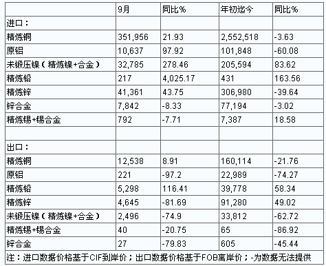 以下為中國(guó)海關(guān)最新公布的中國(guó)海關(guān)最新公布的中國(guó)9月精煉銅、原鋁等基本金屬商品進(jìn)出口數(shù)據(jù)一覽(單位均為噸):