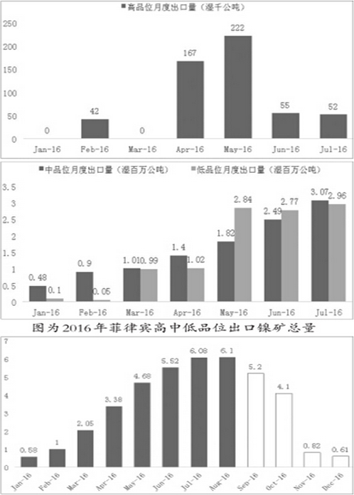 根據海關總署的數據,2015年,菲律賓累計向中國出口鎳礦3428萬噸,約占中國進口鎳礦總量的97.17%,約占菲律賓鎳礦總出口量的75.6%;2016年上半年,菲律賓累計向中國出口鎳礦1067萬噸,占中國進口鎳礦總量的95.8,約占菲律賓鎳礦總出口量的62%。可見中國是菲律賓鎳礦的第一出口國,同時菲律賓鎳礦對于中國的重要性也不言而喻。