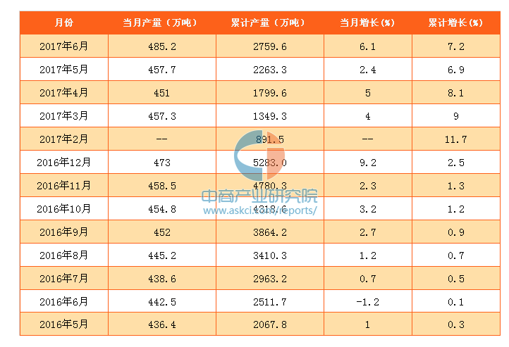 據中商產業研究院大數據庫顯示:2017年6月中國十種有色金屬產量為485.2萬噸,同比增長6.1%。2017年1-6月中國十種有色金屬產量為2759.6萬噸,同比增長7.2%。