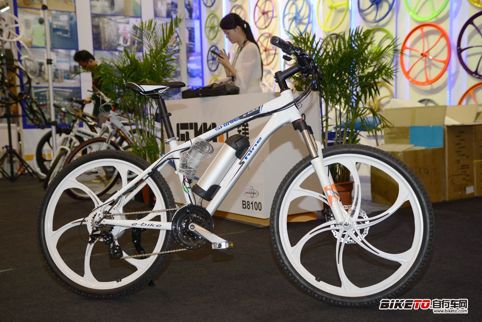 白色的一體輪配合造型簡潔的電動助力自行車,提升了整體外觀的速度感