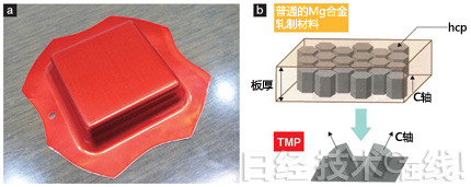 由該公司提供的沖壓用板材采用了鎂鋰合金。由過去的鑄件一邊,到為了滿足日益擴大的鎂合金壓延材料需求,利用日本金屬公司的自主軋制技術(shù),開發(fā)其他公司所沒有的材料。能夠冷壓成形的板材“TMP”(Texturecontrolled Magnesium alloy Plate)就是其成果之一。這種材料跟必須熱壓成形的普通鎂合金不同,能夠冷壓成形〔圖(a)〕。其成分跟AZ31基本相同,因此在加工后科采用AZ31的表面處理和修飾方法。