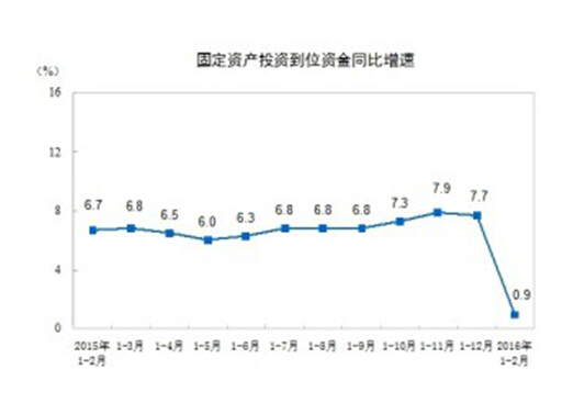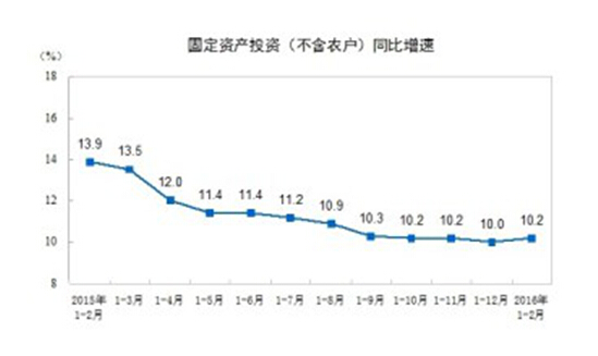 據(jù)中國國家統(tǒng)計局最新公布,2016年1-2月,中國固定資產(chǎn)投資(不含農(nóng)戶)38008億元,同比名義增長10.2%。從環(huán)比速度看,2月份固定資產(chǎn)投資(不含農(nóng)戶)增長0.83%。