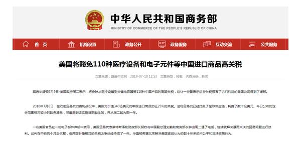 據商務部網站7月10日援引路透社消息,美國政府周二表示,將免除從醫療設備到關鍵電容器等110種中國產品的高額關稅,這讓一些曾表示這些關稅損害了它們利潤的美國公司得到了緩解。