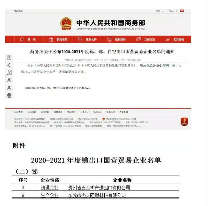根據(jù)2019年12月中華人民共和國商務部發(fā)布了《商務部關于公布2020-2021年度鎢、銻、白銀出口國營貿易企業(yè)名單的通知》,全國共有11家企業(yè)獲得銻品出口資格證,其中杰夫集團控股公司東峰銻業(yè)旗下兩家子公司持續(xù)獲得2020-2021年度銻品出口資質,分別是:東莞市杰夫阻燃材料有限公司、貴州省五金礦產進出口有限公司。